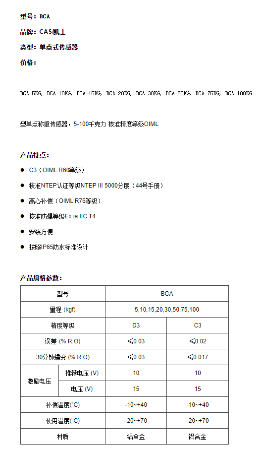 ??BCA是一款铝制的单点式传感器,适用于中型尺寸的商业秤,台秤和计数秤