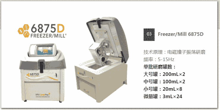 SPEX冷冻研磨仪,采用电磁撞子专利研磨技术,将装有样品的密闭容器浸入液氮中,在-196℃环境下,快速彻底地粉碎样品,使研磨时间更短,研磨样品更为精细,同时保证样品性质不发生变化,是公认的“zhong极研磨手段”,广泛应用于生物化学、动植物、医学、矿物学、材料科学等领域。