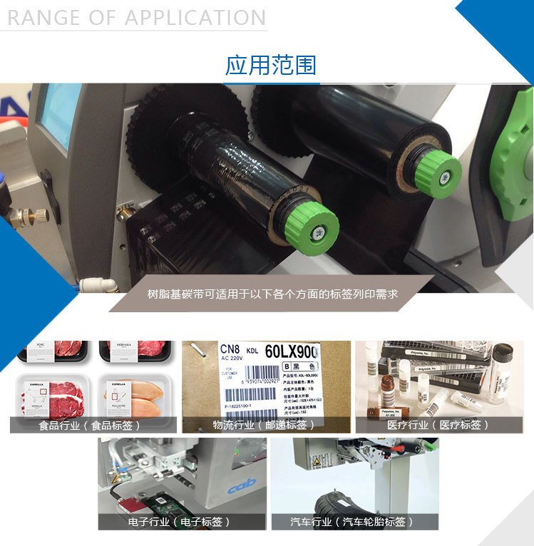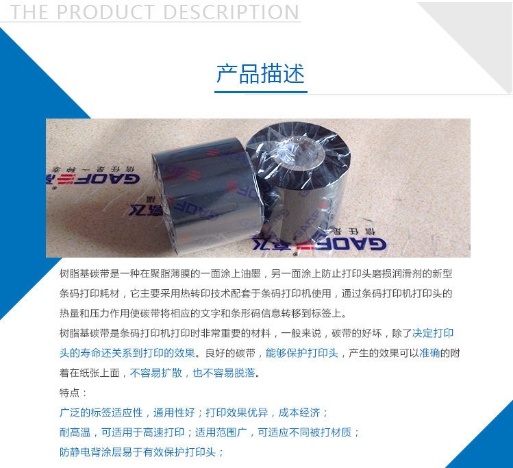 树脂基碳带品质高、高速打印性能,优异的耐磨擦、耐热、耐腐蚀、耐久性能,耐磨能满足各种苛刻环境要求,高敏感度,确保优异的图像打印效果,防静电背涂层,有效保护打印头。