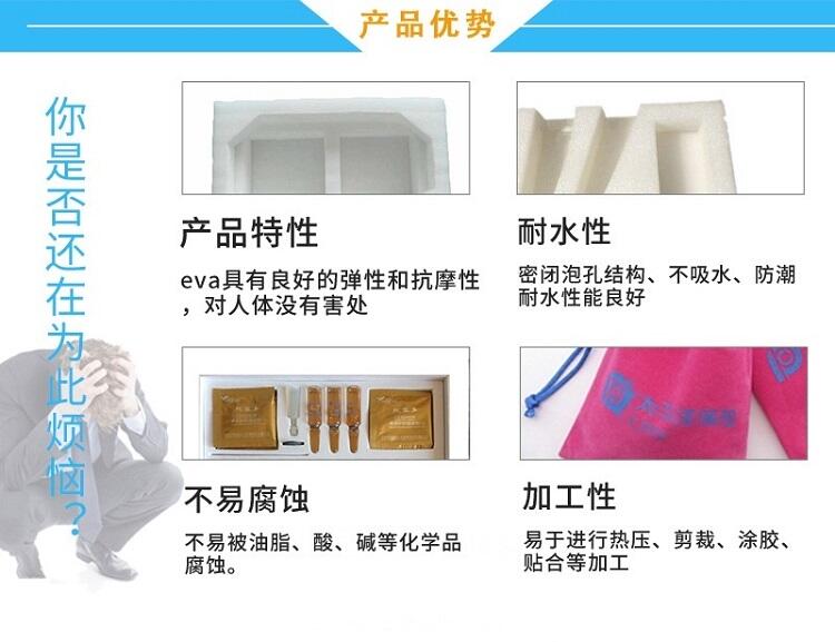 EVA俗称泡棉,是一种新型环保的包装材料。它由eva发泡而成。克服了普通发泡胶易碎、变形、回复性差的缺点。1:具有隔水防潮、防震、隔音、保温、可塑性能佳、韧性强、循环再造、环保、抗撞力.防滑防震能力强等诸多优点,亦具有很好的抗化学性能,是传统包装材料的理想替代品。