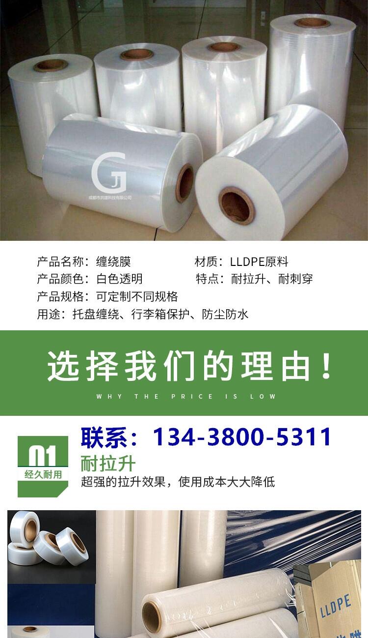 产品可在不加热的情况下,进行纵横双向冷拉伸,对任何物品都能裹紧,具有防松散、防雨、防尘等。拉伸膜也称缠绕膜或弹性薄膜或裹包薄膜,具有自粘性,是一种单面或双面有粘性 可拉伸并裹紧被包物品的塑料薄膜,且自粘胶不会附着在被包物品表面,在包装过程中不需要进行热收缩处理,有利于节省能源,降低包装费用,便于集装运输,托盘与叉车相结合的“集全装卸”方法降低了运输费用,同时透明度也便于识别被包物品,减少配送错误。 各种PE环保透明拉伸膜,PE环保黑色拉伸膜,抗穿刺抗撕裂性能强、收缩记忆持久 、强韧性,透明度、拉伸度、单面粘性、防腐蚀的、等特点。薄膜产品具有膜卷均匀,拉伸度,任性,抗刺穿力、粘性等特点,产品厚度从0.013mm—0.10mm,手用宽度常用规格为60mm120mm200mm300mm350mm450mm500mm1000mm宽幅