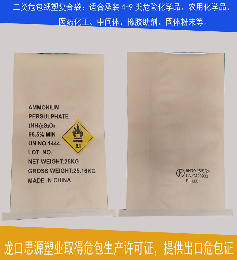 采用pp塑料编织袋与OPP 、珠光膜复合而成,具有强度高、耐冲击、防潮、抗滑性好,可加内膜袋,特殊规格可根据客户需求定制。适合承装原药、农药、中间体、塑料原料、砂浆、饲料、建材、危险化学品、精细化工产品、种子、矿粉、复合肥料、纳米材料等。