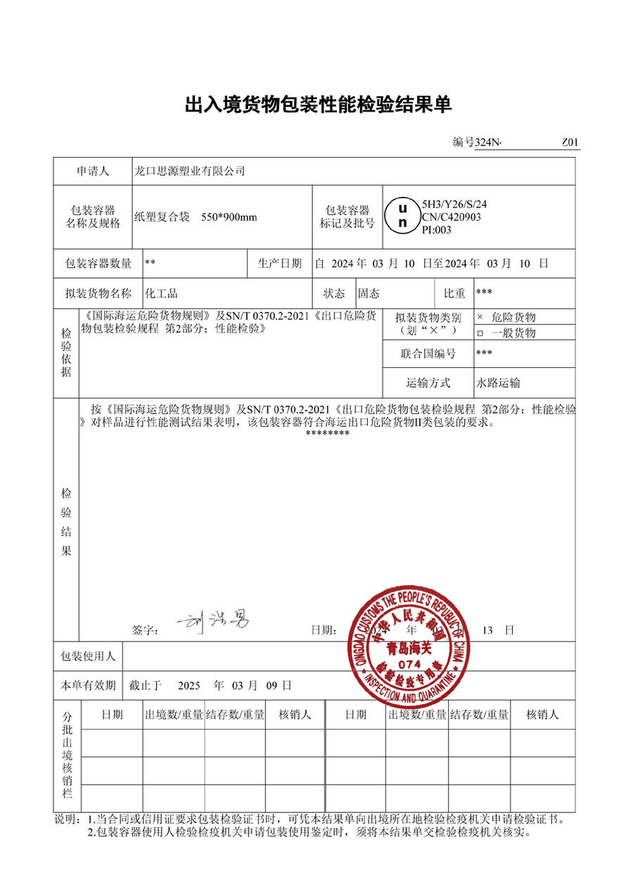 龙口思源塑业有限公司主营吨袋、纸塑复合袋、复合编织袋、塑料袋、纯牛皮纸袋。公司取得食品包装、危险品包装全国工业产品生产许可证,并由烟台龙口市出入境检验检疫局颁发“出口危险货物包装生产企业分级”、“出口食品包装备案书”,可以出具危险品、食品包装性能证。公司能根据客户要求定制化工出口危险品包装袋,提供危包出口性能单,危包出口商检单,危包生产许可证等,满足客户出口和内销需求。