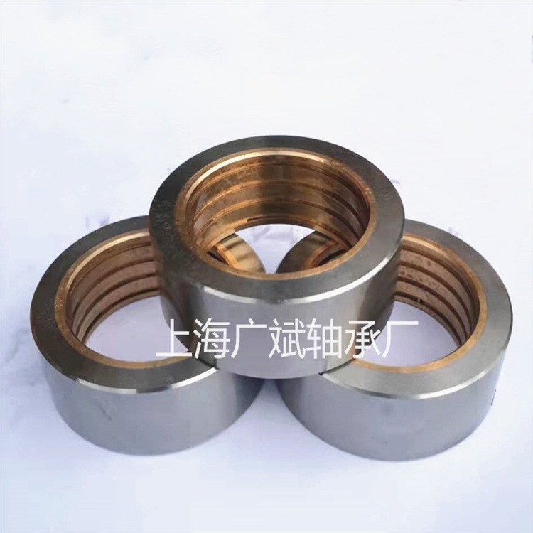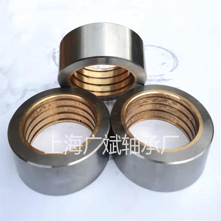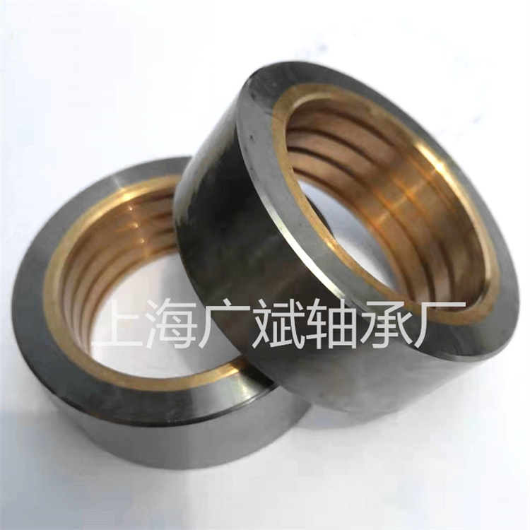 钢浇铜滑动轴承,钢铜烧结轴承,钢包铜自润轴承,JF800双金属轴承,是以钢背为基体,表面是用45号钢为基体、与耐磨铜合金烧结,压铸等工艺而成型,在无油滑动的情况不下,铜层也可以在短期内达到自润滑效果。标准的合金材料:有:CuPb10Sn10CuSn6Zn6Pb3CuPb24Sn4CuPn30,AISn20Cu等。由于基板稳定为低碳钢材料,所以对轴套的外径加工精度有了保障,而且在产品装入座孔后不需要螺钉固定,依靠过盈配合就能防止走外圆现象;内表面合金化学成分的改变能够满足不同承载压力,不同使用温度,不同滑动速度的要求,摩擦面在生产中设计出不同结构的油槽,油穴能满足不同加油方式的要求,并能防止咬轴现象。