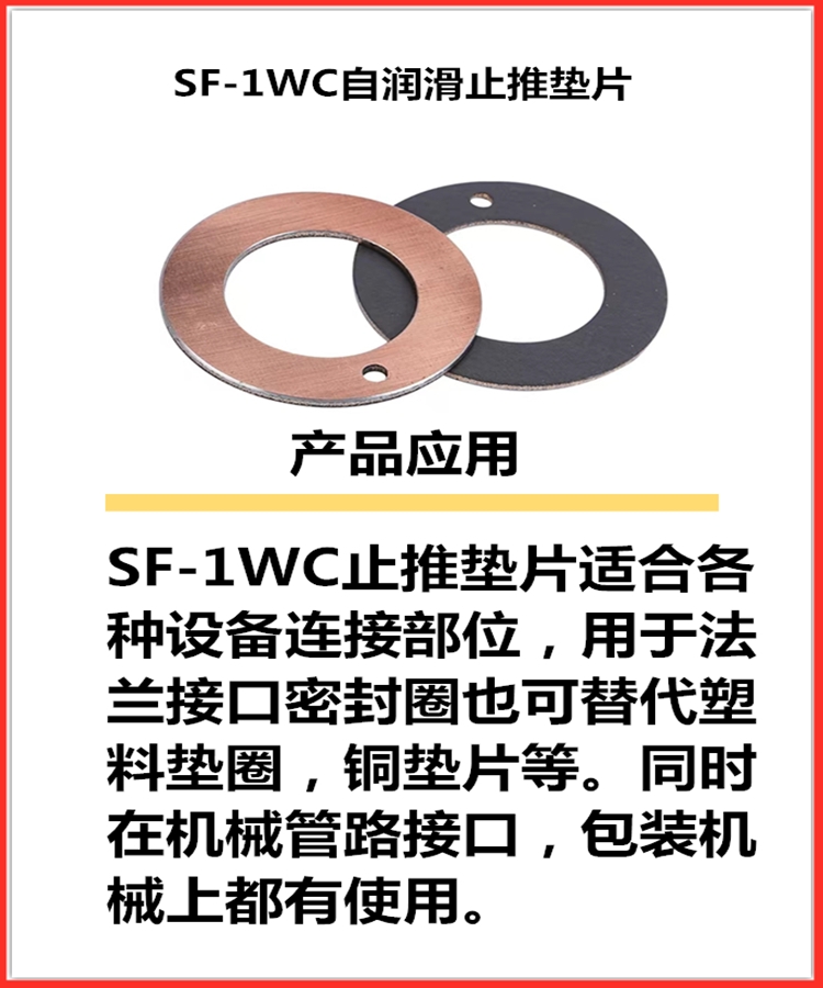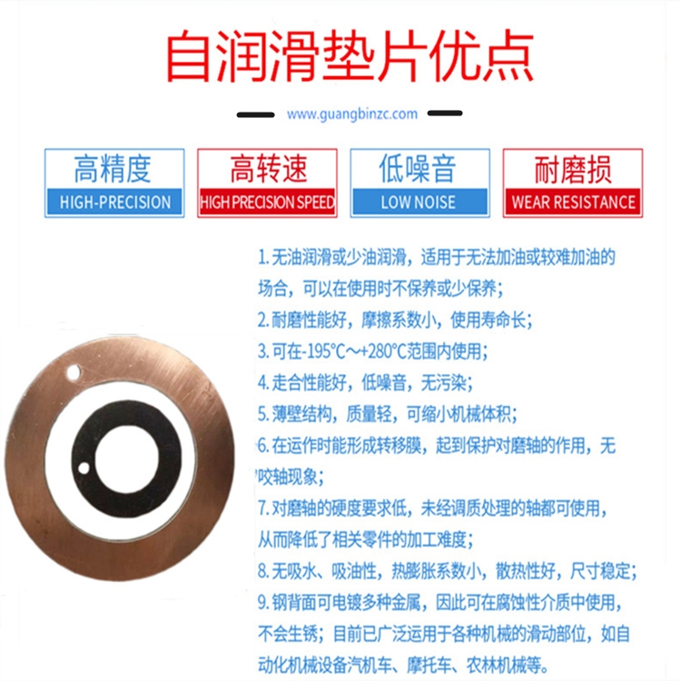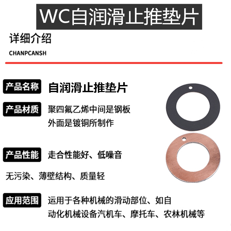 无油自润滑WC止推垫片垫圈无油止推垫片是以优质的低碳钢为基板,中间烧结球形多孔铜粉层,表面扎制以PTFE 为主的耐磨润滑材料作为轴承工作层,这种材料具有优异的机械承载能力,中间铜粉层不但可以及时传递轴承运行过程中产生的热量,同时也提高了塑料层与基板的结合强度。PTFE 设计适用于完全干摩擦状态,并根据润滑情况、摩擦系数和耐久性要求开发了多种材料。