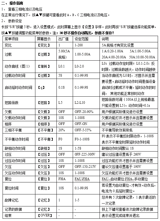 ●过载 ●堵转 ●短路 ●欠载 ●相序 ●缺相●三相不平衡 ●过压 ●欠压 ●五次故障记忆 ●复位方式可选●过载动作时间定时限反时限通用