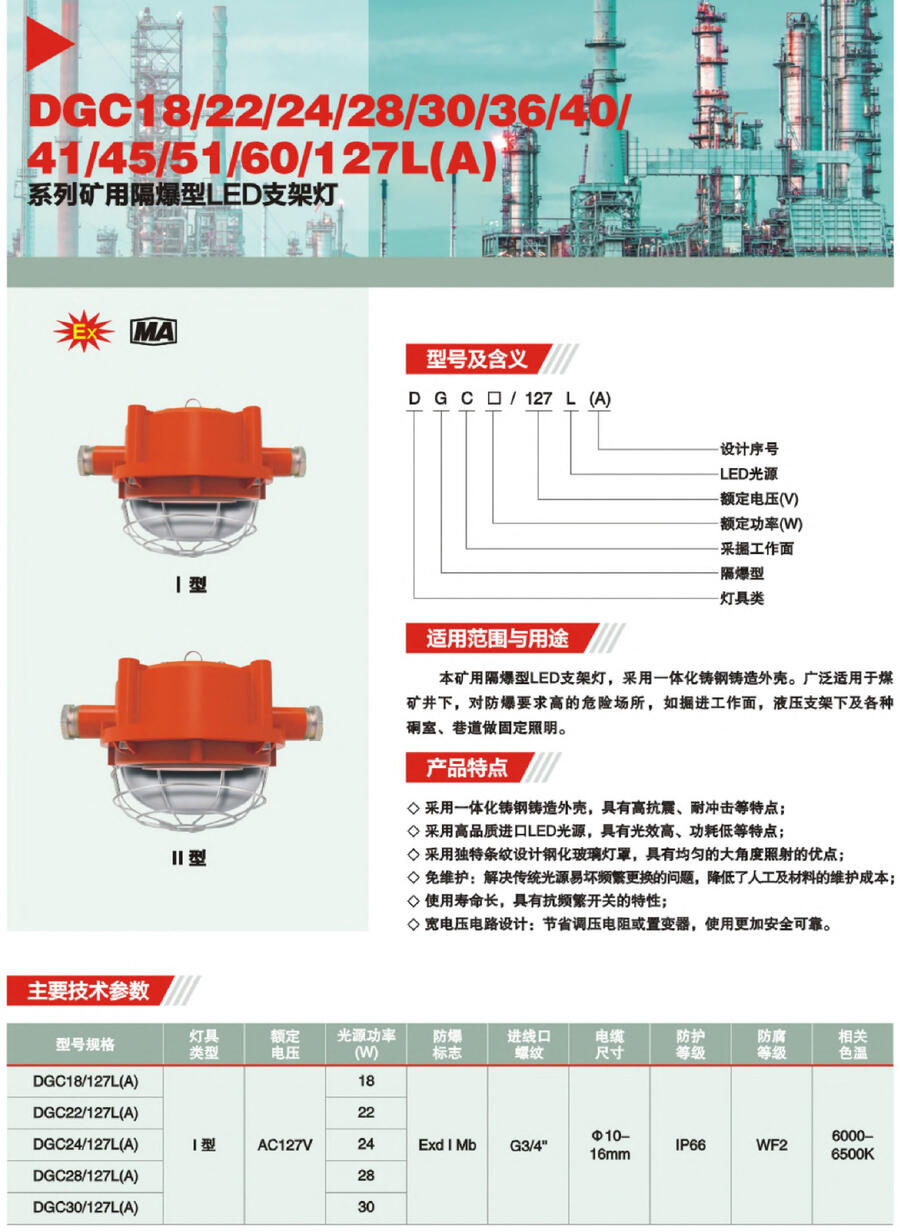 DGC18/22/24/28/30/36/40/41/45/51/60/127L(A)矿用隔爆型LED支架灯