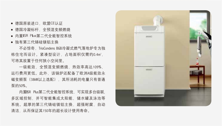 TrioCondens BGB冷凝式燃气落地炉专为独栋住宅而设计。紧凑型设计,占地面积仅需约0.4m2,可将其放置于任何狭小空间里。