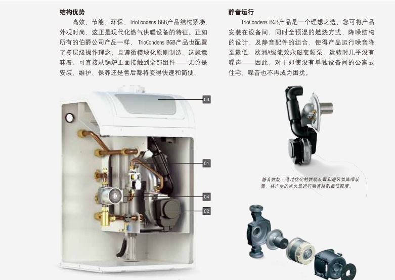 一级能效,全预混变频燃烧,热效率高达109%,运行费用更低。此外,该锅炉还配备了欧洲A级能效永磁变频泵(38kW以上选配),其所消耗的电量只有普通泵的50%。