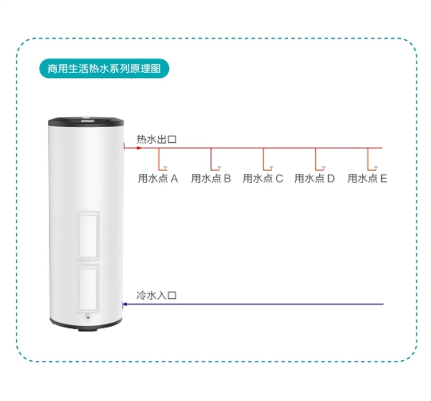 产品可满足宾馆酒店、理发店、足浴、旅馆、美容院、餐馆、员工宿舍、别墅等场所用水量大、用水频率高、多取水点同时使用的热水需求。
