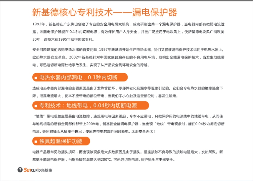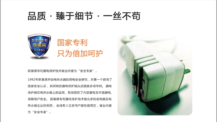2003年04月 新基德“安全王”系列电热水器研制成功,该系列产品针对中国家庭普遍存在的不良用电环境,有效实现了产品安全到环境安全的跨越;