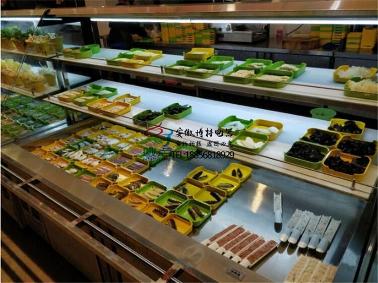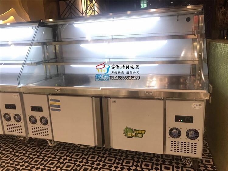 4、冷柜默认前后敞开,方便顾客选购菜品,厨房添加菜品,展示效果好。冷柜也可定做前面夜帘,后面平移玻璃门,保鲜效果更佳