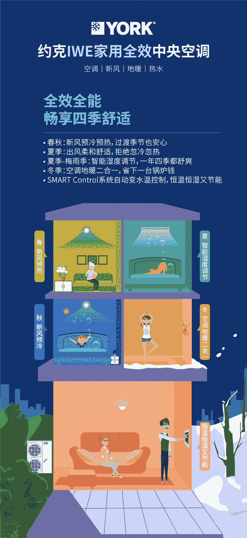约克IWE变频智能水生态系统,一拖多结构仅需要一台室外机即可搞定, 有集中式送风设备的项目,可在过度季节尽量利用新风或全新风运行,减少空调的运行,减少能源的浪费,约克智能水生态系统大幅降低运行开支