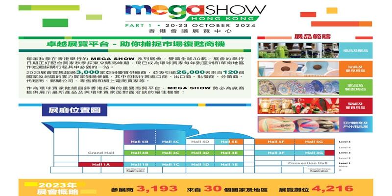 这项定在每年秋季的超大型采购盛会,于2023年昂然步入第30个年头,再度汇聚3692家来自亚洲及世界各地的厂商参展。上届MEGA SHOW系列展,共吸引近32609名来自120个国家及地区的买家到场参观和作一站式采购,当中大部份为国际Z名的入口商、出口商、批发商、分销商、采购代理、邮购公司及零售商等。参展商可充分运用这四天的会期,广结来自世界各地的庞大买家群,并成功取得大量订单。由于成效昭著,行业中的不少厂商被迫苦等多年以求能获得展位。