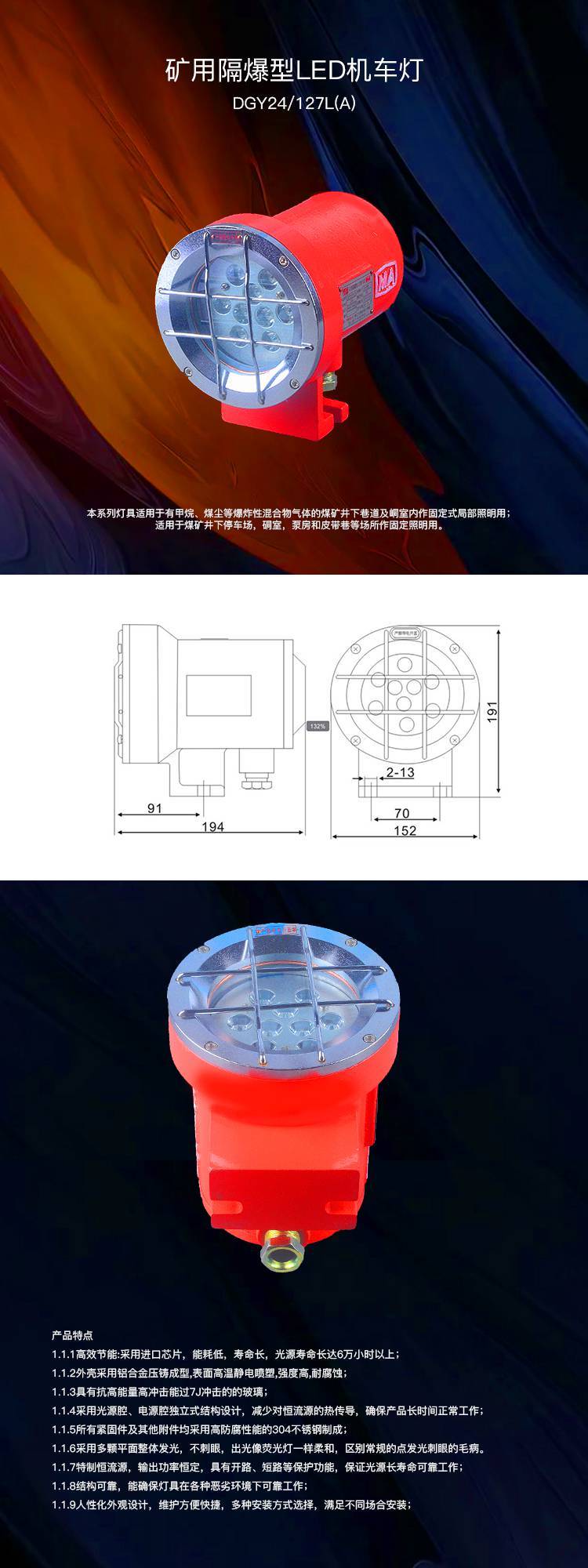 LED矿用隔爆型机车灯主要适用范围:主要适用于具有甲烷和煤尘爆炸危险的矿井下的蓄电池式电机车、掘进机、扒装机、铲煤机、装载机、钻车、胶轮车以及各种井下用防爆车辆等,供机车工作照明使用。
