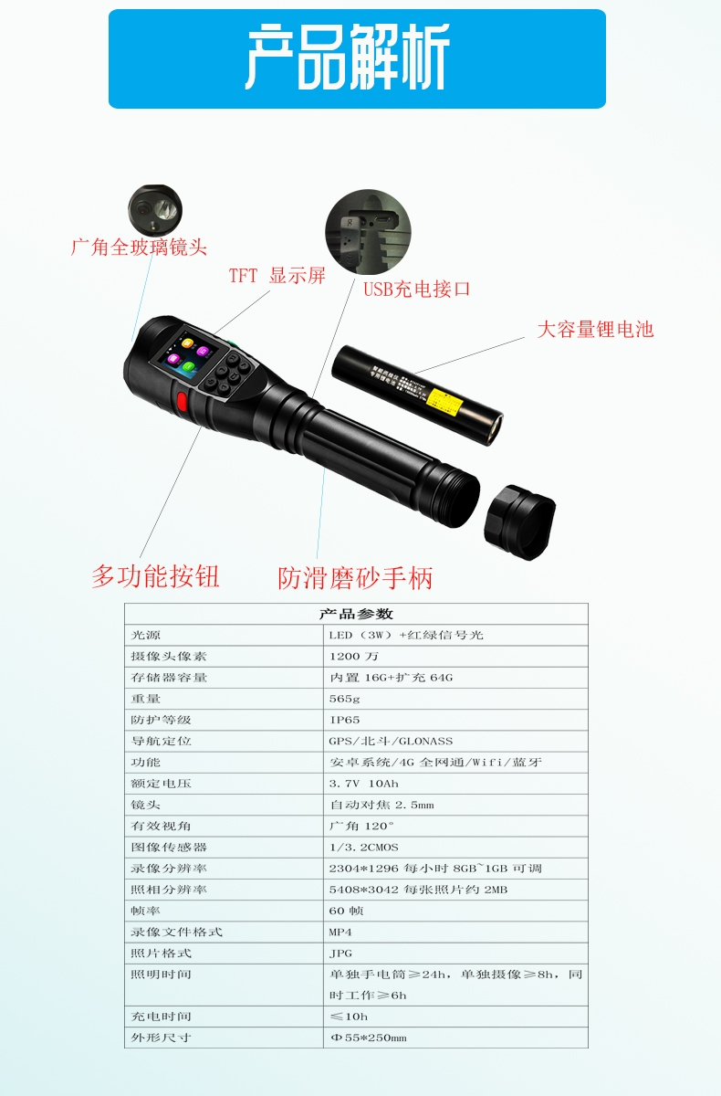 照明时间:单独手电筒≥24h,单独摄像≥8h,同时工作≥6h