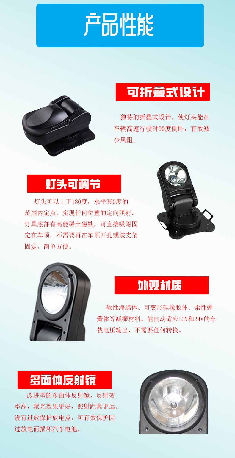 可靠耐用:采用进口高硬度材料,具有极高的抗强力碰撞、防震和抗冲击力;重量轻,独特的折叠式结构,能在车辆高速行驶时90度卧倒灯头,有效减少风阻;