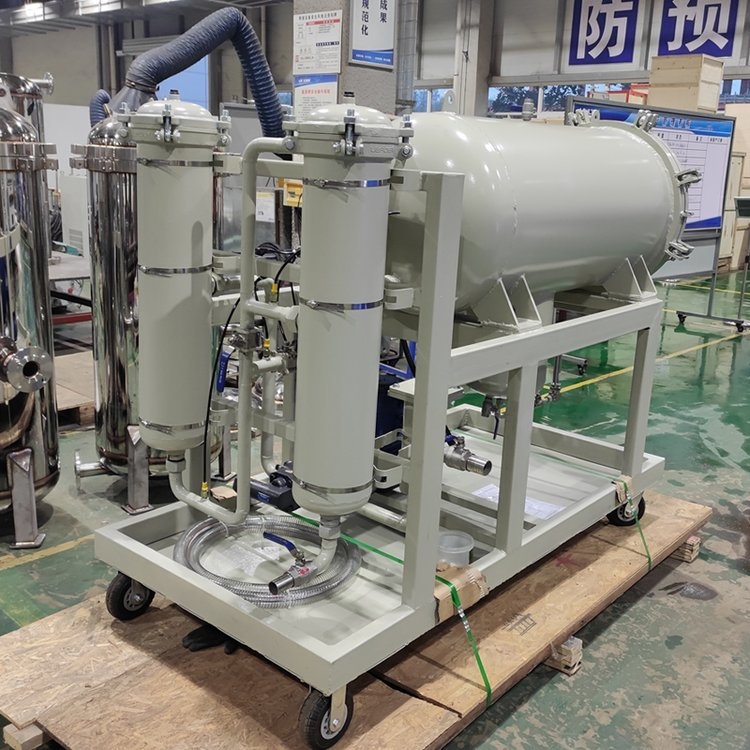 油液中水的存在会引起氧化,使油液变质,减小润滑油膜厚度,降低润滑性,引起油液变性聚合而成大分子,使液体粘度改变,形成有机酸,腐蚀金属表面,降低或丧失油液介质电强度。我公司研制的聚结脱水滤油机集精密过滤和高效脱水两种功能为一体,可有效清除油液中的颗粒杂质和乳化水、游离水,对于含大量水分的油液(含量可达15%),其分离速度是传统分离方法的几倍到几十倍,因而在汽轮机油及变压器油的净化、液压润滑系统油的除水及除杂质过滤、提高油液使用寿命等方面具有广泛的应用。