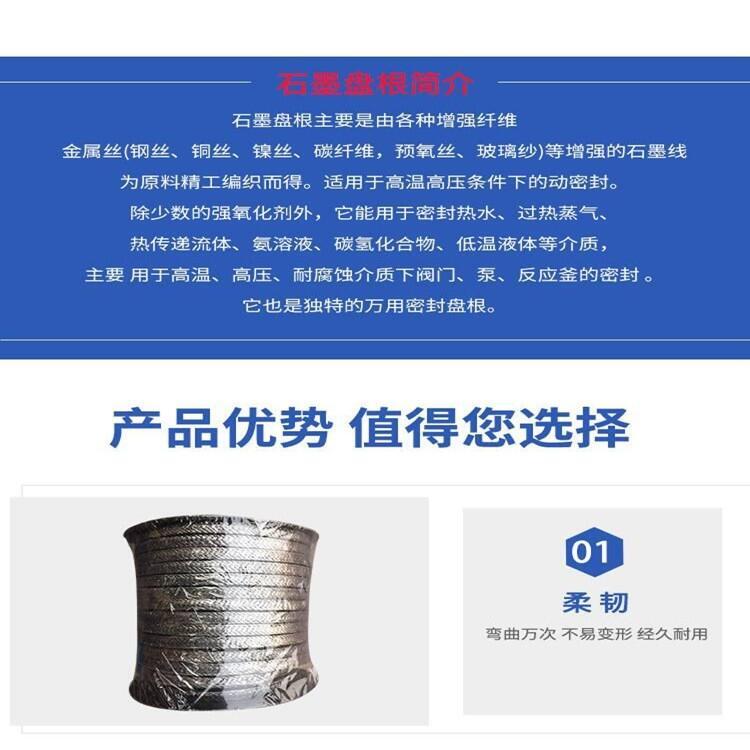 ,换热介质 氨、溶剂、碳氢化合物、低温液体等介质,石墨盘根密封填料多用于石油、发电厂、化工、钢厂等