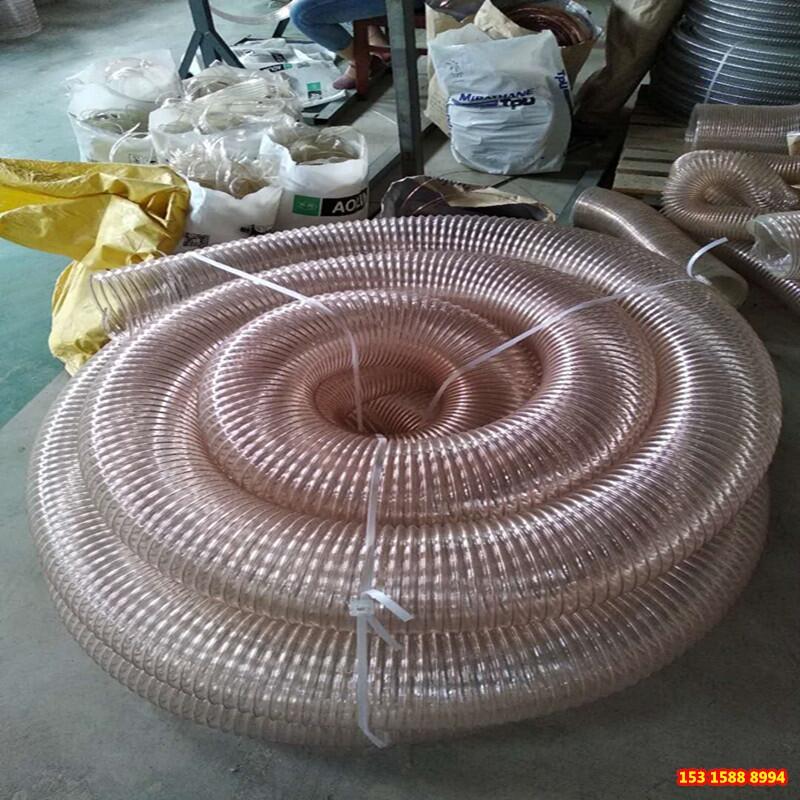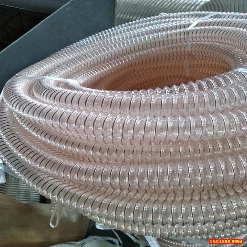 透明钢丝管采用德国进口PU原料制造,非常的耐磨而且耐高温,特别适用于磨损性非常大的的固体如灰尘、粉末、纤维、屑片和颗粒,气体和液体环境,供除尘和吸取式厂房,工业真空吸尘器,纸类和纺织纤维。PU吸尘管也可应用于建筑工程领域,在建筑和装饰领域中。