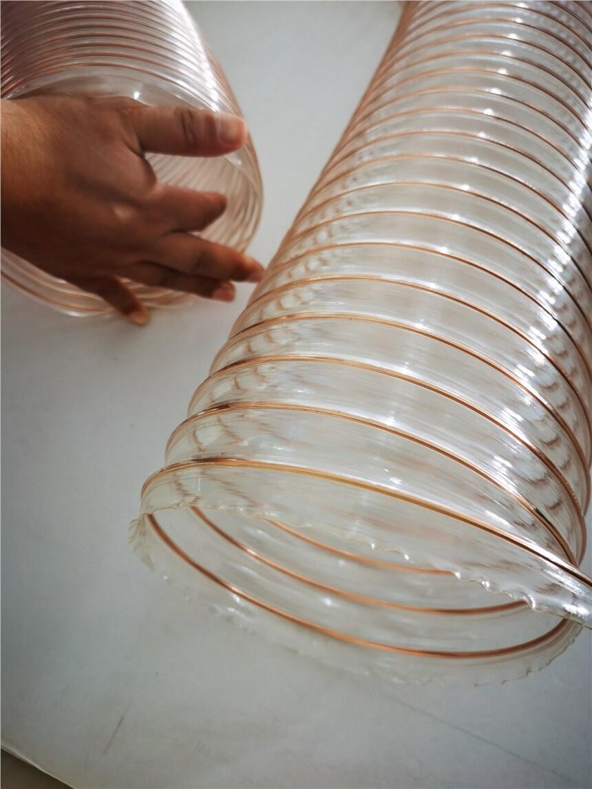 原材料:墙面材料:不锈钢螺旋钢丝加固,特种玻璃纤维涂层,螺旋钢丝:镀锌钢。温度范围:零下60度至+500度,短时间可达到+550度。第二,弹性好,进口pu镀铜钢丝除尘管伸缩自如,可随意弯曲,伸长率也非常不错。内壁和外壁光滑抑制颗粒吸附和微生物滋生,确保关键加工环节的卫生清洁。