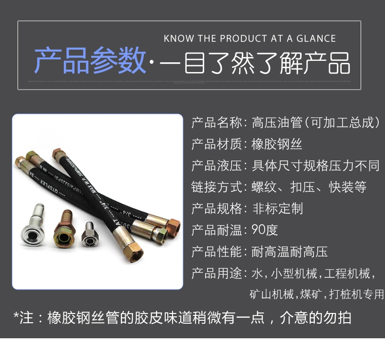 油管由钢丝缠绕骨架层和内外耐油、耐腐蚀合成橡胶组成,用于工程机械液压油管、海底天燃气、石油、灌溉、钢厂、化工厂等介质的输送。