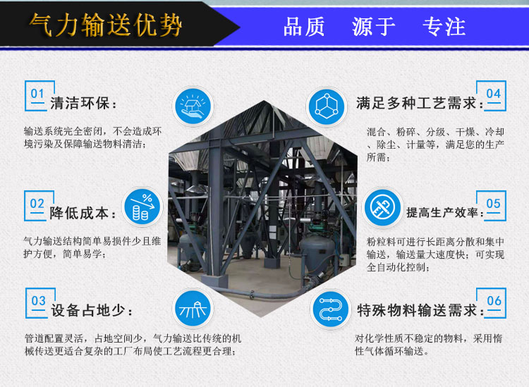 气力输送优点 | 全程密闭管道输送布置灵活无物料污损 | ||