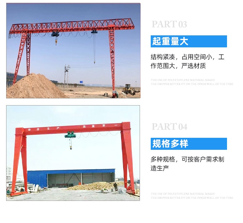 MH型电动葫芦门式起重机与CD、MD等型号的电动葫芦配套使用,是一种有轨运行的中小型起重机,主梁U型槽板与工字钢焊接而成的组合梁,大车运行机构采用三合一驱动装置。其适用起重量3~20吨,适用跨度为12~30米,工作环境-20摄氏度~+40摄氏度内。单梁门式起重机主要适用于工厂、码头、车站用于搬运,起吊各种笨重的成件物品和各种类型的材料。使用电磁吸盘时可以搬运钢板、型钢和另散的钢材(废料)。不适用吊运赤热或熔态金属及强烈腐蚀性气体的工作场所工作。起重机按工作繁重程度,机构级别定为A3-A5。起重量20t以下的起重机为单钩起重机,即仅有一套起升机构; 其结构简单、安装、使用、维修方便,多用于工厂、货场、码头、水电站等频度低或额定起重量起吊次数少的场所。有点:货期快、经济实惠;缺点:使用中晃动相对较大、工作级别低,不适用繁重场合。本起重机设有地面、操纵室和遥控三种操纵形式以供用户选择使用。