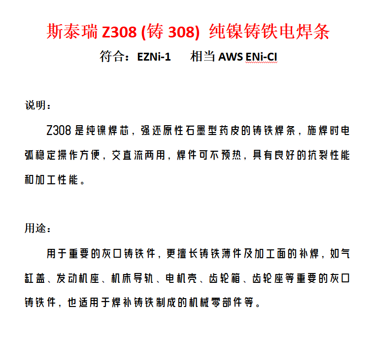 型号 | Z308/铸308/EZNi-1纯镍铸铁电焊条 | ||