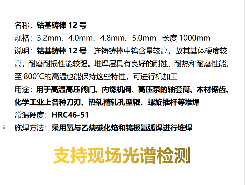 适用范围 | 如汽车、内燃机气门、高温高压阀门、热剪切刀刃、热锻模等同时经受冲击和高温场合以及轴承的内、外环、高温高压阀门、内燃机阀、高压泵的轴套筒、木材锯齿、化学工业上各种刀刃、热轧精轧孔型辊、螺旋推杆等堆焊 | ||