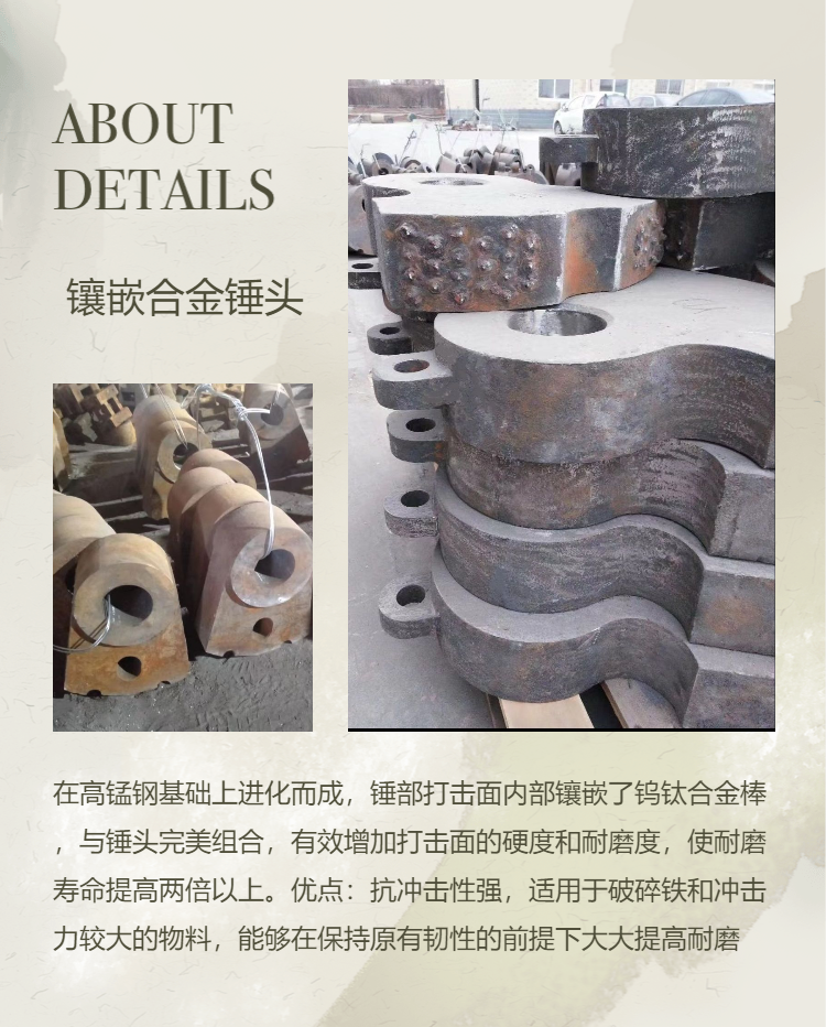 配件名称 | 高锰钢镶嵌钨钛合金耐磨锤头 | ||