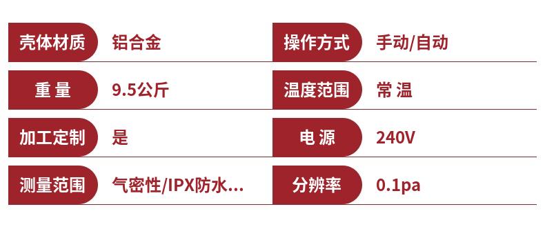 气密测试仪器 9.5公斤 铝合金 电源240V 四个 常温 手动/自动 是否支持加工定制 | 否 | ||