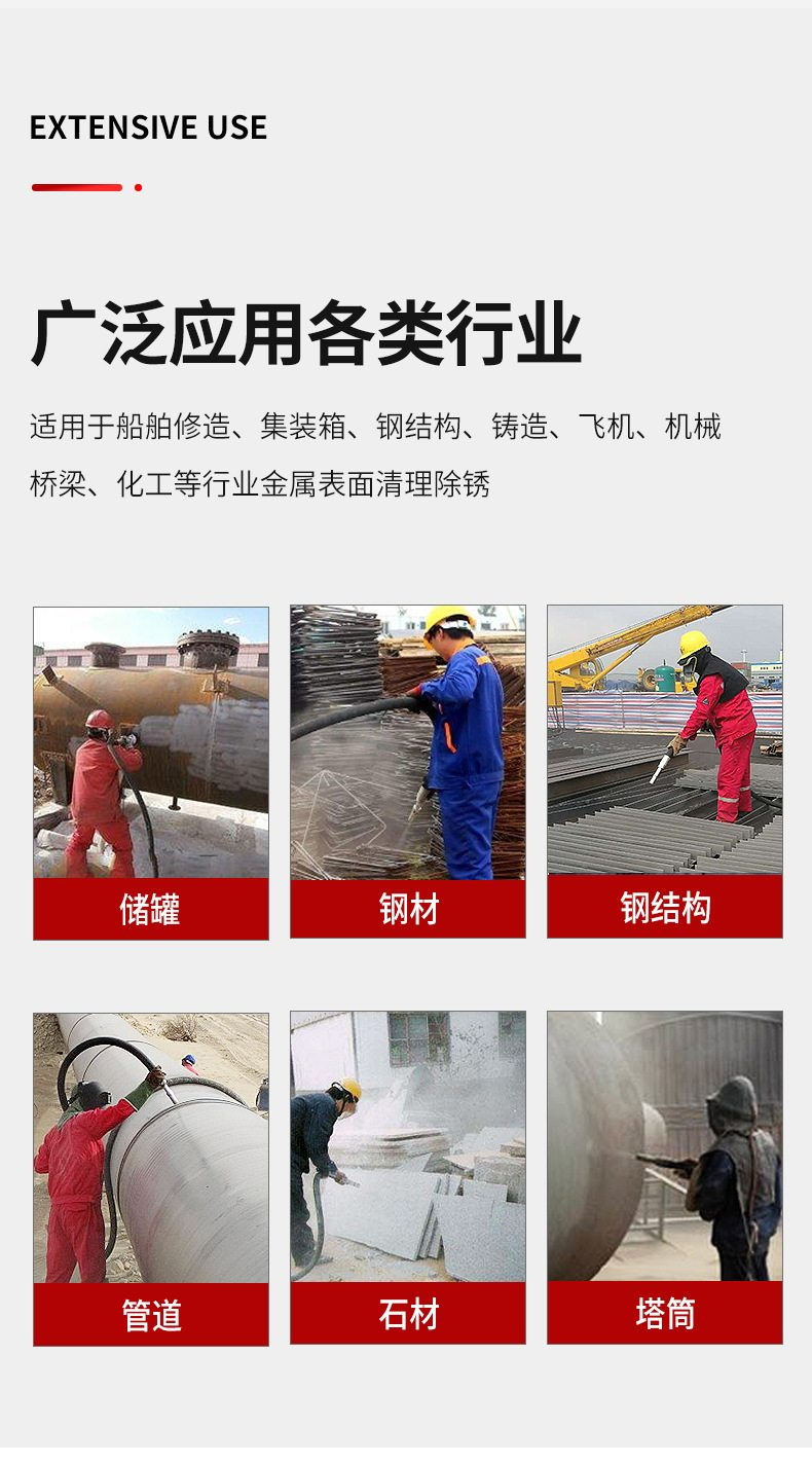 用途范围 | 钢结构、钢板、管道防腐保温除油除锈 去除厚油漆涂层 | ||