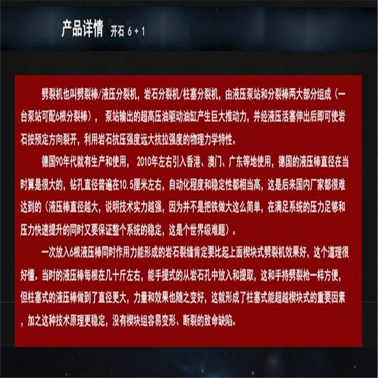 主要由油缸、杆、控制阀、输油管、楔块等组成,液压作为驱动源,应用楔块原理,经机械放大,仅需40MPa(400kg/cm)的压力就能产生5000吨力(目前国内经过市场检验达到这个技术参数的设备仅一家生产),利用岩石的抗压强度高、抗拉强度低的特性,将岩石内部结构达到的效果。据性试验数据显示:在莫氏硬度大于7的岩石上,拆除效率是破碎锤的5倍以上