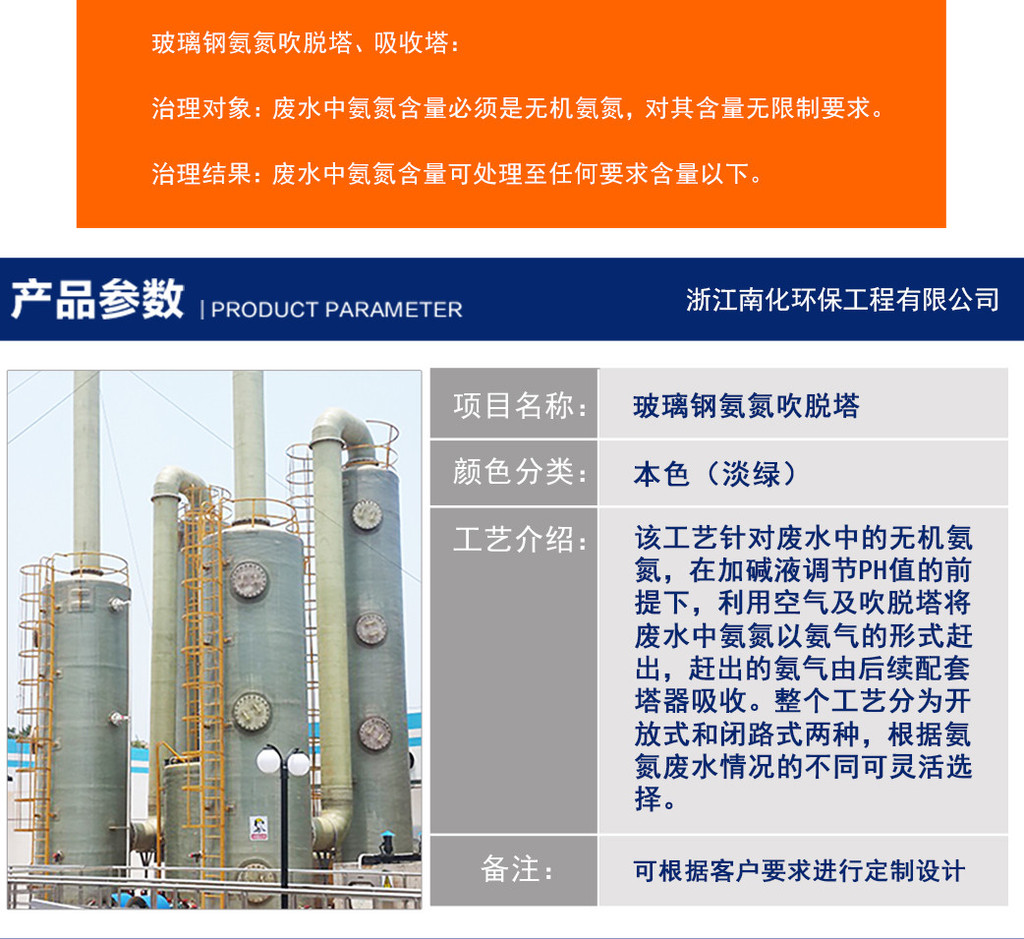 机电之家网厂家浙江南化防腐设备有限公司为您提供玻璃钢氨氮吹脱塔 玻璃钢氨氮吸收塔 玻璃钢管道 玻璃钢烟囱的详细产品价格、产品图片等产品介绍信息,您可以直接联系厂家获取玻璃钢氨氮吹脱塔 玻璃钢氨氮吸收塔 玻璃钢管道 玻璃钢烟囱的具体资料,联系时请说明是在机电之家网看到的。