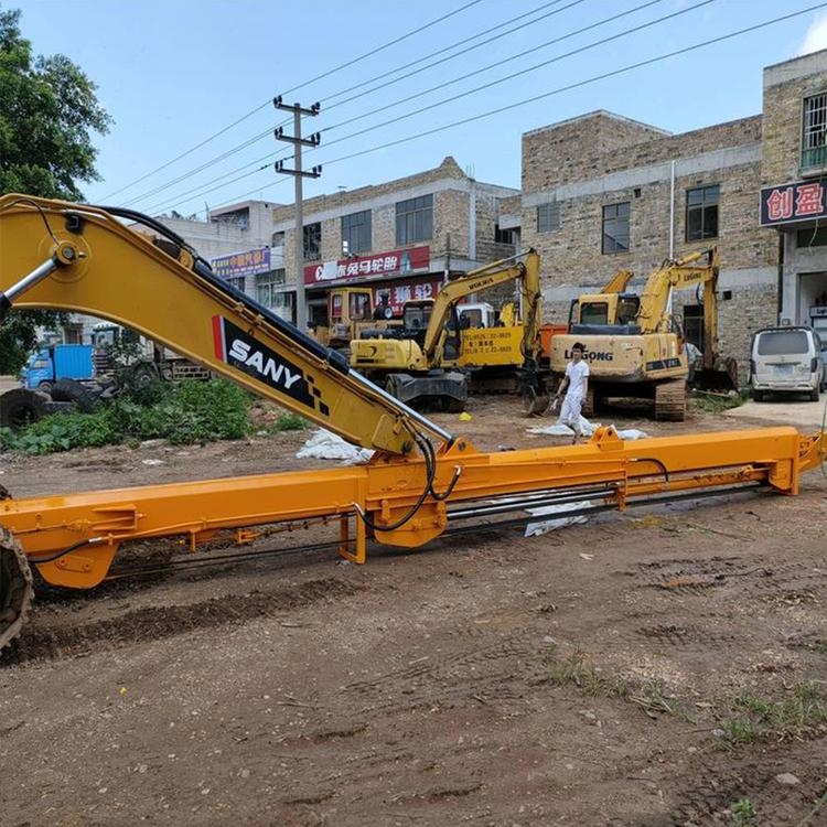它是将挖机原有的小臂拆下来,吧连接支架焊接好,直接套斗轴上使用。由于它另一端部分是悬空外置的,保证了设备的平衡,