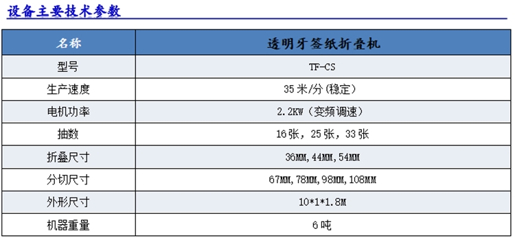 该机是一款生产特殊抽取式透明牙签纸后道设备,生产的产品每张互相铰链,将上面一张抽出时,下张纸头同时露出包装外。折叠机采用变频调速电机控制,自动折叠功能。