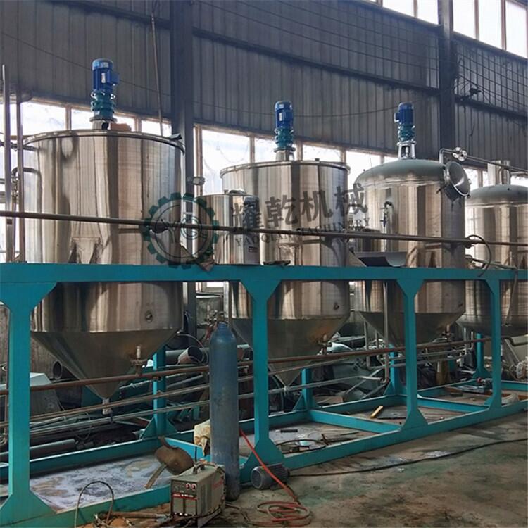 为满足小规模油坊的需要,耀乾机槭设计出了小型油坊油脂精炼的成套机组,实现脱磷、脱胶、脱酸、脱水、脱色一体化流水作业,从而实现了大型炼油小型化、工业炼油民用化,如今耀乾机械成套精炼油设备正加速走进各地中小型油厂,可直接灌装销售油脂精炼,通常是指对毛油进行精制。毛油中杂质的存在,不仅影响油脂的食用价值和贮藏,而且给深加工带来困难,但精炼的目的,又非将油中所有的杂质都除去,而是将其中对食用、贮藏、工业生产等有害无益的杂质除去,如棉酚、蛋白质、磷脂、黏液、水分等都除去,而有益的”杂质",如生育酚等要保留。因此,根据不同的要求和用途,将不需要的和有害的杂质从油脂中除去,得到符合一定质量标准的成品油,就是油脂精炼的目的。