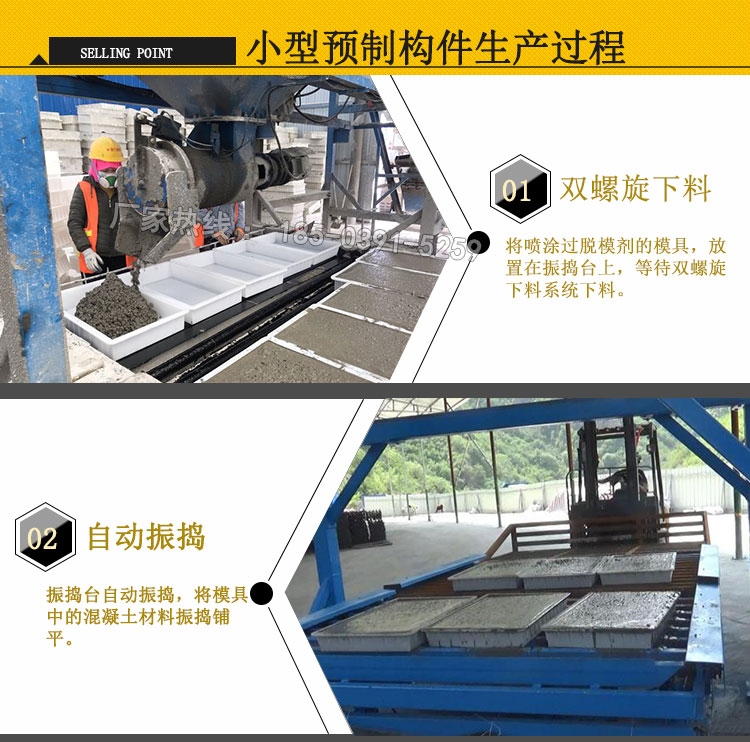 两个端盖,对应安装在所述壳体的前后端;螺旋杆,包括沿前后向延伸的轴杆、及设于所述轴杆上的螺旋叶片,所述轴杆用于带动所述螺旋叶片在所述壳体内转动,以将从所述进料口进入到所述壳体内的混凝土输送至所述出料口。 小型预制构件生产线 水沟盖板预制生产线 小型预制构件预制方案。