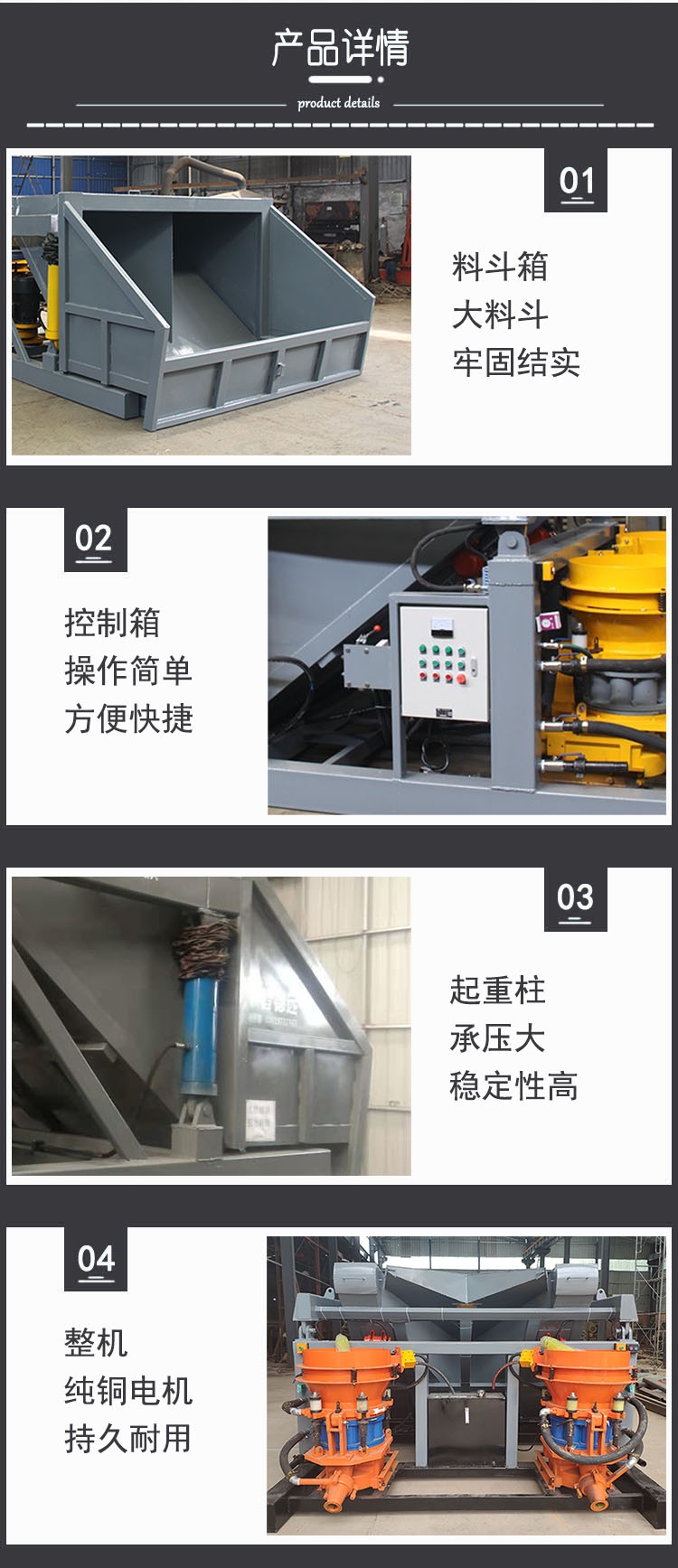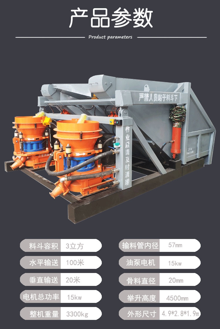 在转子的每个料有一个、转子与凸轮组成联动机构、在转子的转动中,通过凸轮、杆、转子联动机构迫使在料上下、完成下料和喂料。混凝土料由强制喂入气料混合仓、与压缩空气混合后形成稀薄流形态、通过管道输送到喷嘴,这种机内泵送和管道稀薄流输送相结合的混凝士输送、在一定程度上综合了泵送型和风送型湿喷机的优点。使用湿喷机进行混凝土作业,可以大幅度粉尘浓度和回弹率,增大一次喷层厚度,生产效率,保证工程。带料斗的喷浆机 一拖二7型喷浆机组 一拖二单料斗自动上料喷浆机
