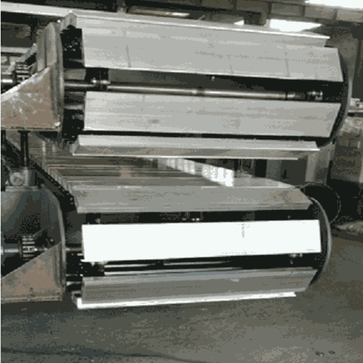 铝板样式为1355*200,装有轴承,通过拖链形式,利用5.5kw电机进行传动,用铝板传动优点在于:1、铝板的导热系数高,对于冬季砂浆纸岩棉复合板板材里的聚氨酯的发泡,板材的粘接能力都有很好的提升。