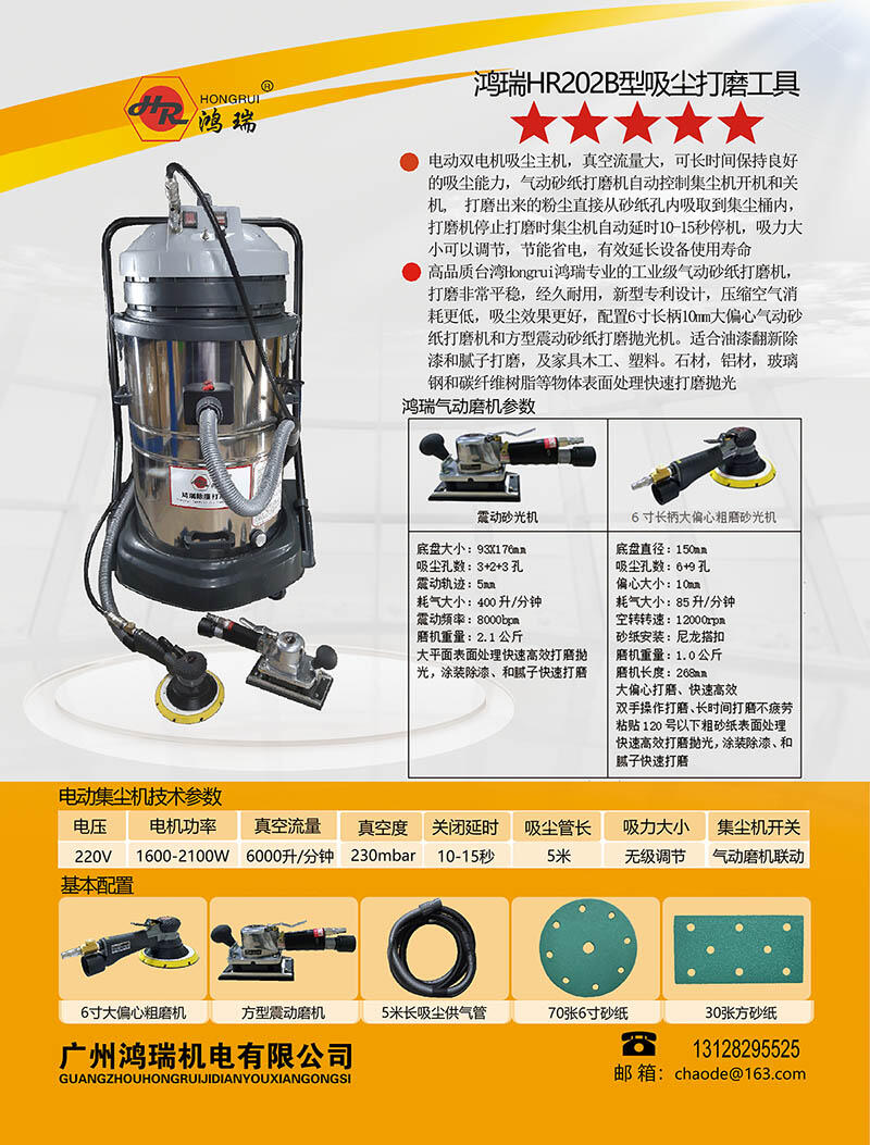 3、台湾鸿瑞高品质工业级气动磨机,可在工厂打磨线长时间打磨,内螺纹吸尘口结构,吸尘管直接旋进磨机吸尘口不会松脱了。6寸长柄大偏心粗磨机,大偏心打磨、快速有力,双手操作打磨、长时间打磨不疲劳。粘贴120号以下粗砂纸玻璃钢、环氧树脂、碳纤维等复合材料、铝材、大理石、木制品、橡塑制品、金属氧化层等表面处理快速打磨抛光,涂装除漆、和腻子快速打磨;93X176mm方磨机震动式打磨,平衡度高,研磨力强,双手用力压下磨机不会停,大平面玻璃钢、环氧树脂、碳纤维等复合材料、铝材、大理石、木制品、橡塑制品、金属氧化层等表面处理快速打磨抛光,涂装除漆、和腻子快速打磨