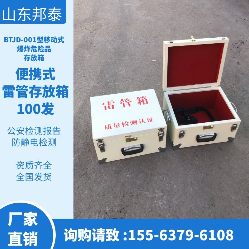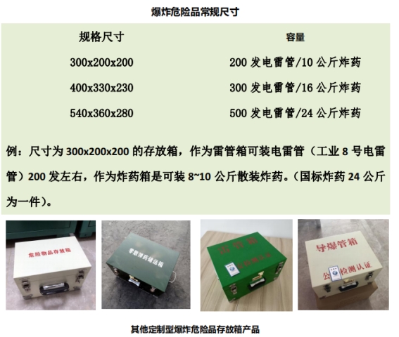 24公斤民爆炸药箱/雷管箱,爆炸危险品存放箱(炸药箱、雷管箱)--是山东邦泰集团生产的一款专门放置导爆管,电雷管,炸药等爆破器材的保管箱。爆炸危险品存放箱按照其功能主要分为雷管箱/炸药箱两种,箱体外置1.0mm厚防爆钢板,内置7.0mm防静电,木板和1.0mm防火防震的阻燃毡。存放箱锁具配有三位防盗机械密码锁+两个不锈钢挂锁扣,是标准双锁配置,符合公安检验标准。箱四角带有不锈钢防撞包角,箱体更加坚固,存放箱配有提手可配合背带使之可背可提便于作业员运输保管。