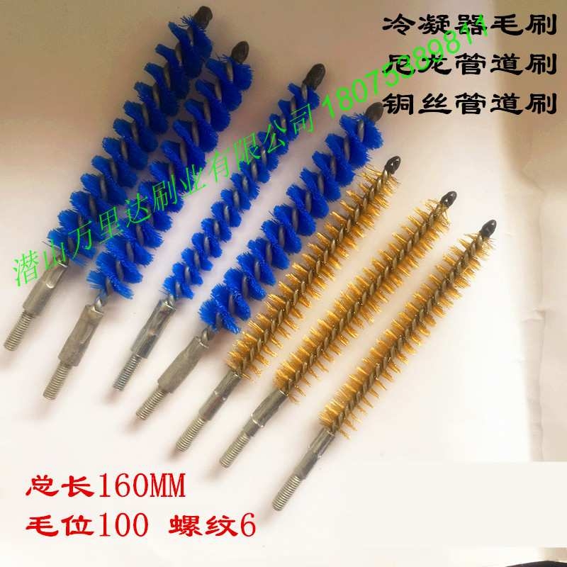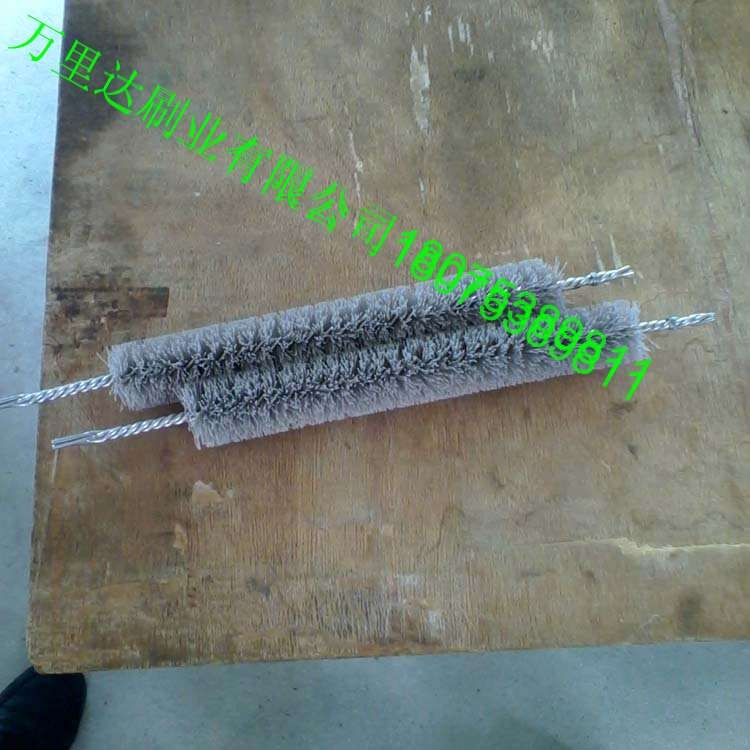 绞线刷扭线刷:单位:mm; 1、钢丝铜丝绞线刷材料:铜丝、不锈钢丝、碳钢丝(丝径ф0.06—ф1.0)、铁线; 可制作双股线、三股线、四股线绞线刷,最小外径可做到4mm;机械零件深孔、相关孔、同心大小孔相连处在加工过程中都会产生毛刺,去除毛刺可以提高零件品质,是机械加工工艺重要一环。利用通道刷处理小孔毛刺是必要,经济,高效率的方法。 2、洗瓶刷材料:尼龙丝(丝径ф0.06—ф1.0)、猪鬃、棕丝、剑麻、不锈钢线;可制作双股丝、三股线、四股线绞线刷,最小外径可做到1.2mm。洗瓶刷用于清除试管瓶、塑料瓶、玻璃瓶、刷毛有尼龙、猪鬃等材料。可按瓶径大小制作毛刷。 管道刷,英文为 tube brush ,又叫试管刷,管子刷,清孔刷,扭丝刷,内孔刷,内管刷,清槽刷等,是一种应用非常广泛的产品,属于抛光清理除、除锈功能的范畴。主要是由铁丝(钢丝)作骨架,加以扭制.上面带有许多排列整齐,向外伸展的细刷丝构成。刷丝材料有尼龙丝,纤维毛,猪鬃,钢丝,铜丝,磨料丝等.管道刷一般使用在液压阀内控去毛刺、缸套活塞内控抛光、钢桶清洗、试管清洗、锅炉清除污垢、金属零件内孔去毛刺等 管道刷的适用范围.