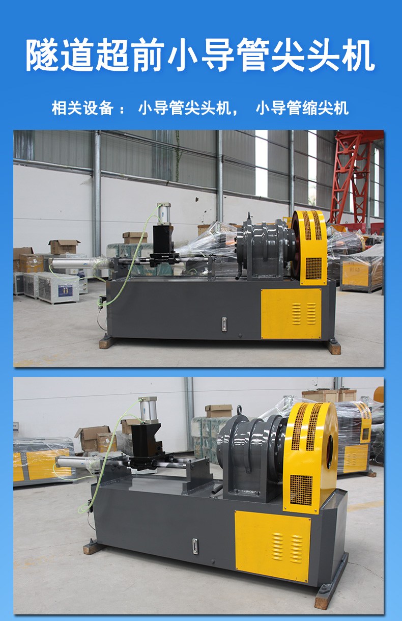 人工焊接效率低,不美观,人工成本高. 此设备可完成钢管尖头成型,打破国内常规连接,使其更机械化,化,专业化。小导管在隧 道开挖时承受地层的压力,为保证灌浆防止漏浆,小导管的尾部需设置封堵孔。 液压冲孔机 小导管钻孔机 小导管冲孔机图文介绍