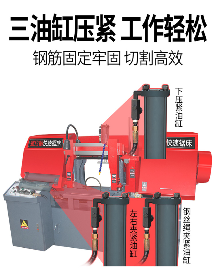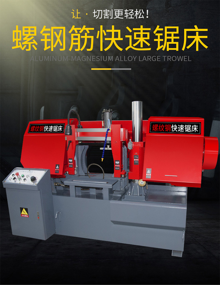 圆料及各种型材的切割,亦可用于切割有色金属及非金属材料。由于带锯 切口窄,切削效率高,因此能耗小,材料浪费少。是一种具有显著节能,节材效果的切割设备。双立柱带锯床主传动采用蜗 轮箱变速,进给采用液压传动,工件采用手动和液压混合式,具有结构紧凑,操作维修方便等特点。 金属切割带锯床 数控液压切整捆钢筋带锯床 半自动工字钢切割锯床