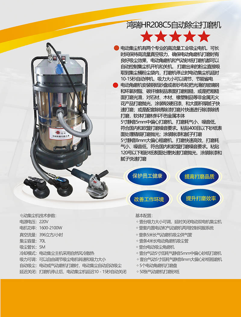 1、电动双电机集尘主机,真空流量大,吸力大小可调。内置电动和气动打磨机两用伺服系统。电动和气动打磨机都可以自动控制集尘机开机和关机,打磨出来的粉尘直接吸取到集尘桶内,打磨机停止时电动集尘机自动延时10-15秒关闭,节能省电, 确保设备经久耐用