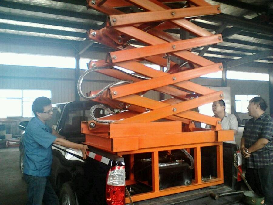 (1) 山东鸿安升降机械厂生产的车载剪叉式升降机采用基装车辆为移动动力,设备升降动力可以根据实际需求,有外接380或220v交流电动力升降;还有直流蓄电瓶提供动力升降;或者车辆带取力器接口的话也可以采用车辆驱动动力升降。