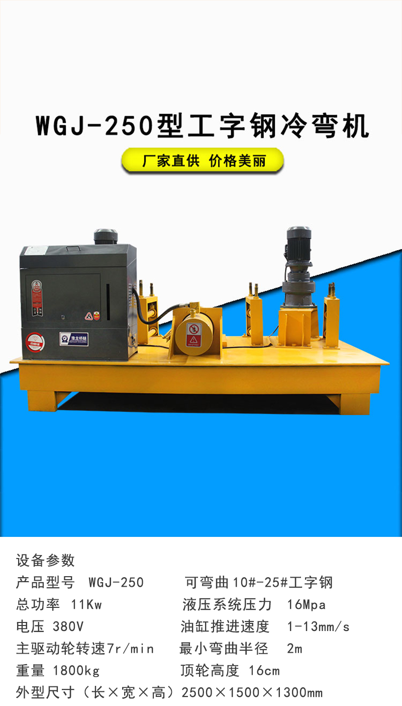 采用大吨位液压油缸,4KW纯铜电机、一体式电控柜等部分组成。整机质保,厂家直供,价格优惠,一机多用。工字钢顶弯机 20号工字钢冷弯机 H型钢弯拱机适合工字钢、H型钢、槽钢、角钢等多种钢材冷弯加工。