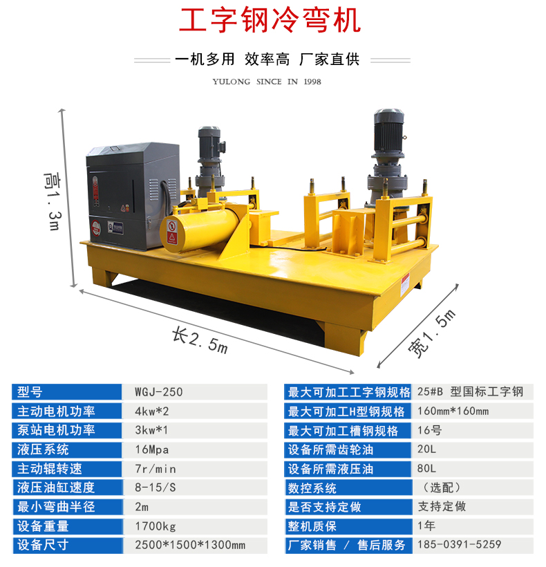我厂主营的型号有:250型、220型、300型、320型等型号,操作简单,一机多用,适用于工字钢、H型钢、槽钢、方钢等钢材的冷弯加工,工字钢顶弯机 全自动数控工字钢冷弯机 小半径隧洞冷弯机需要接三相电,整机瓜式操作,容易上手,一人操作即可。